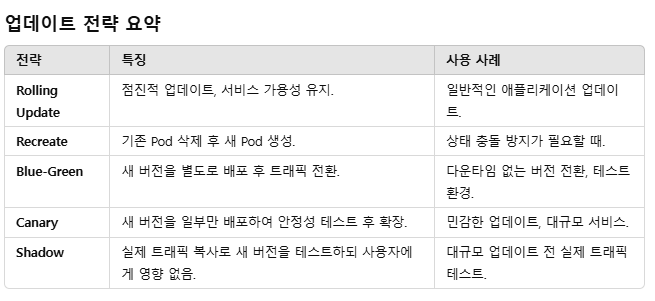 Blue-Green 또는 Canary 배포는 서비스 라우팅 제어(예: Ingress, Service)와 추가 툴(Argo Rollouts, Istio 등)이 필요합니다.